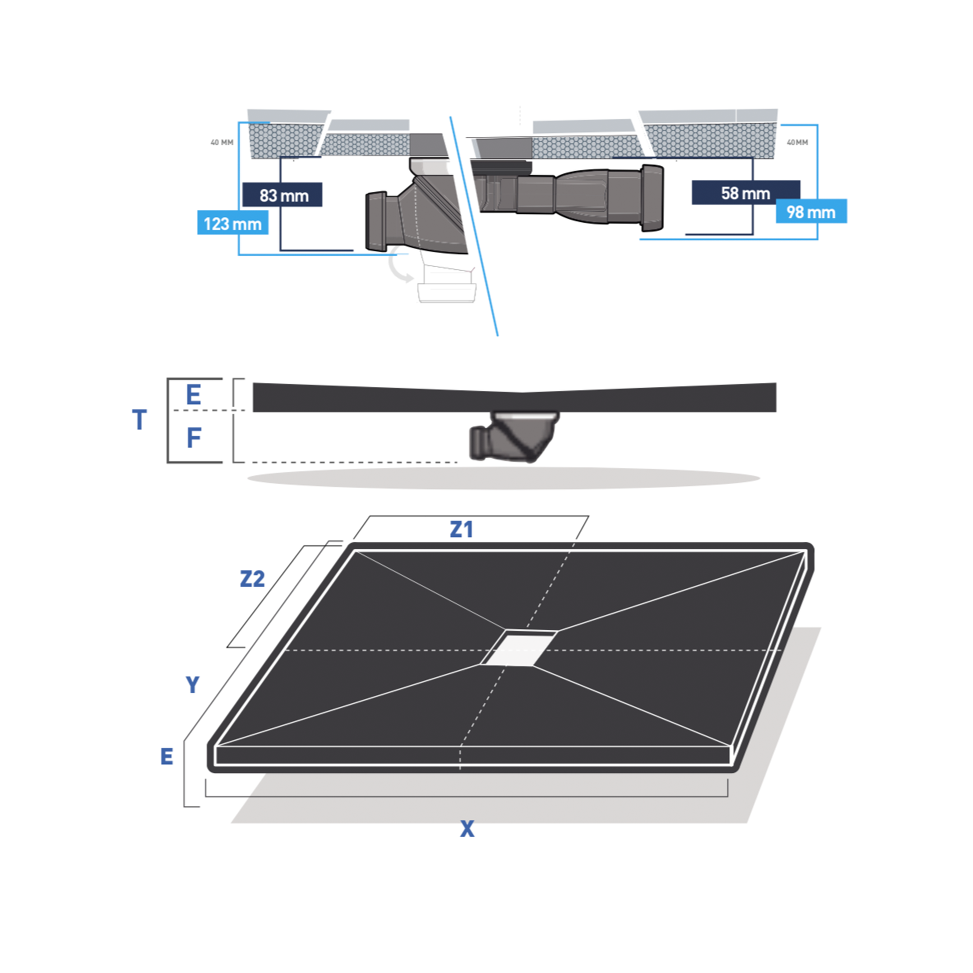 - Sortie siphon : Ø 40 mm